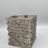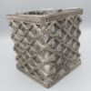 Das Objekt sieht aus wie eine kubische Vase aus dickem und unregelmäßigem Pressglas, das außen mit einem dicken, bearbeiteten Metallgitter bedeckt ist.