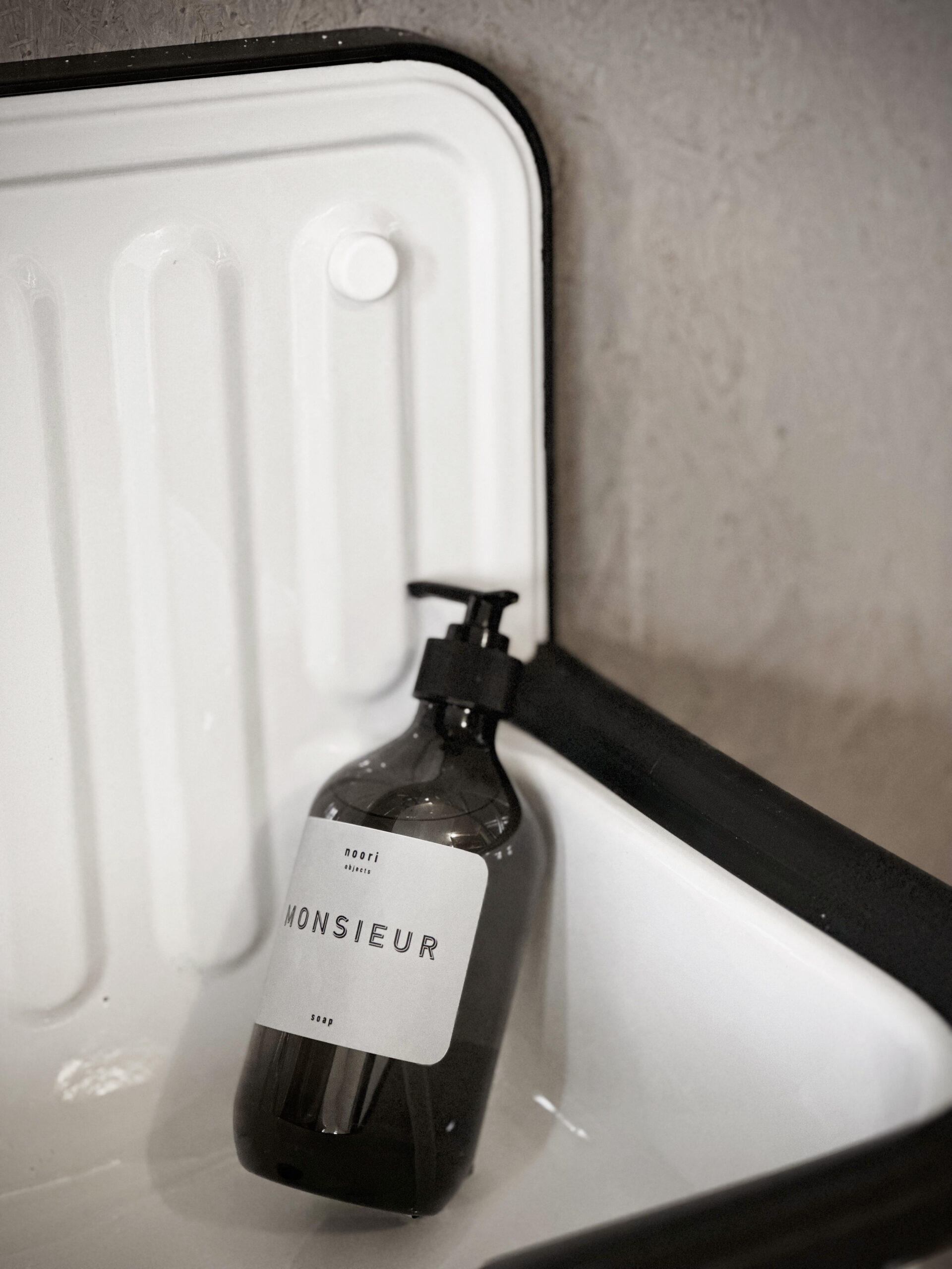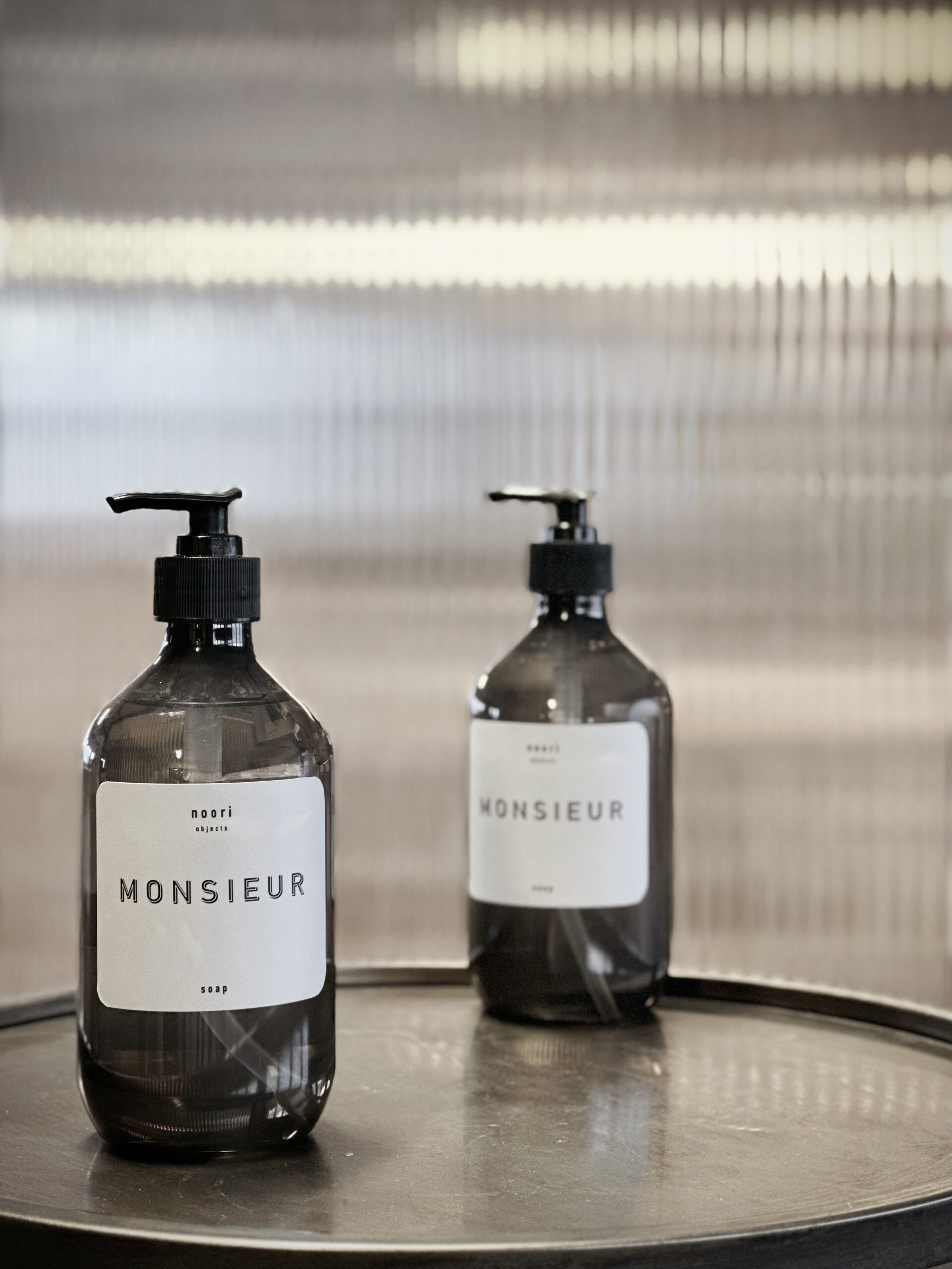 Il sapone liquido MONSIEUR unisce design essenziale e fragranza maschile raffinata, con note legnose e decise che avvolgono mani e corpo in un’esperienza sensoriale intensa e sofisticata. Il flacone in plastica fumé con pompa è progettato per ambienti moderni e minimalisti, offrendo praticità senza rinunciare all’eleganza. Perfetto da solo o in abbinamento al sapone MADAME, MONSIEUR completa un set bagno coordinato capace di trasformare i gesti quotidiani in un piccolo rituale di stile e raffinatezza artigianale.