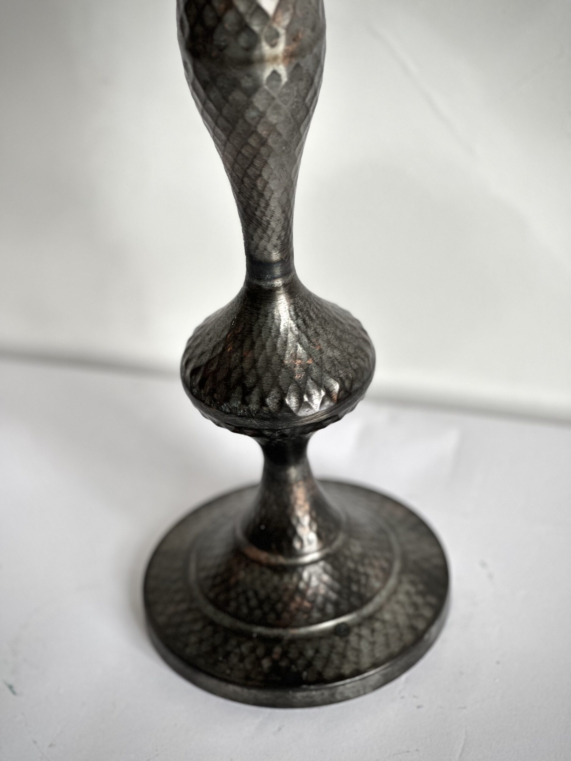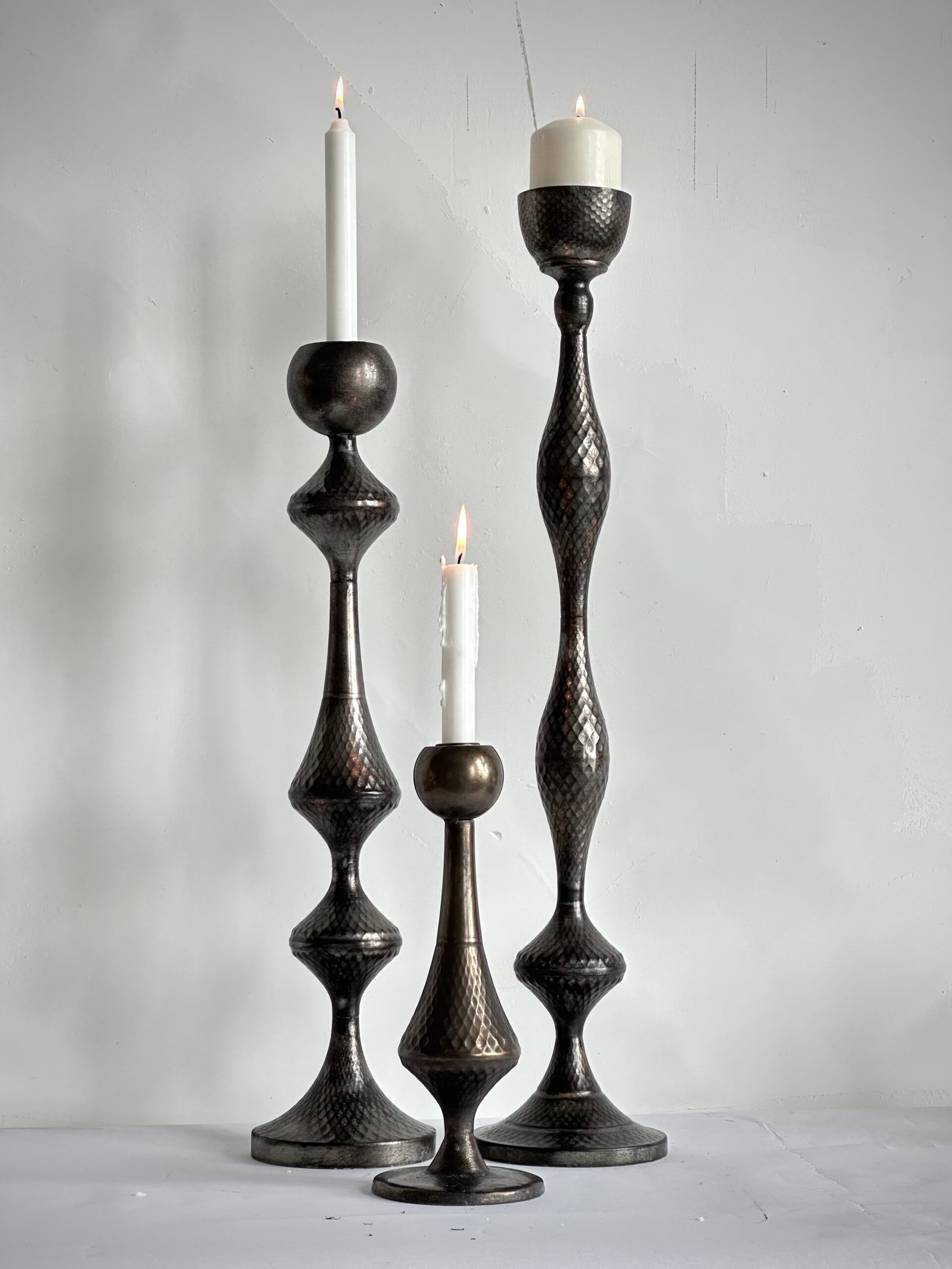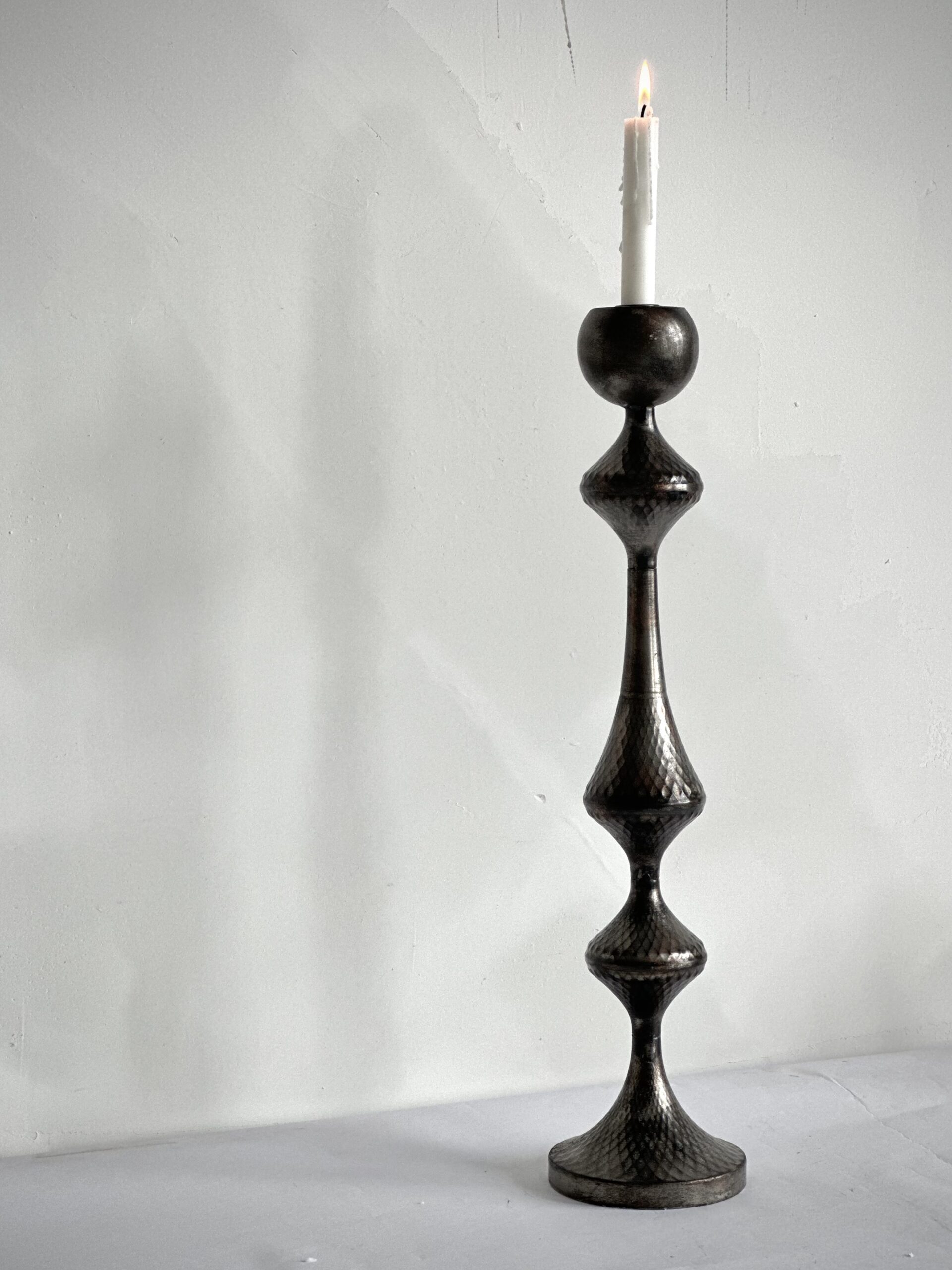 Il candelabro da tavolo in ottone antico, caratterizzato da una finitura martellata che ne sottolinea l’aspetto autentico e artigianale. La silhouette slanciata e armoniosa lo rende un oggetto decorativo elegante e versatile, capace di impreziosire con discrezione ogni ambiente. La lavorazione manuale esalta le irregolarità naturali del metallo, creando una superficie morbida e luminosa che riflette la luce con delicatezza, donando calore e profondità allo spazio.
