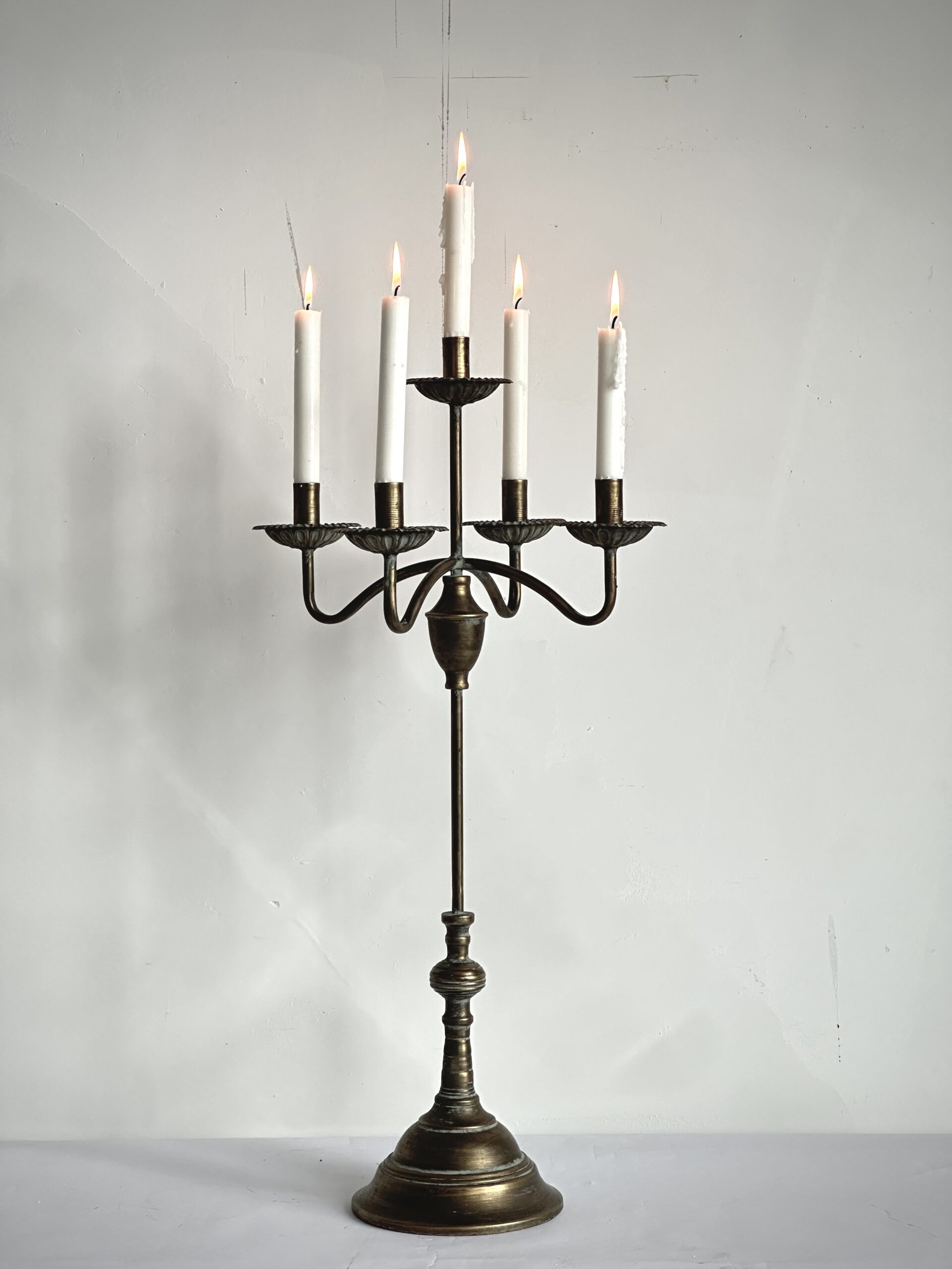 I cinque bracci si aprono in un disegno fluido e simmetrico, creando un gioco di luci e riflessi che trasforma ogni candela in un punto focale di fascino e calore. Le superfici, levigate ma leggermente patinate, diffondono la luce in modo delicato, regalando all’ambiente un’atmosfera intima e sofisticata.