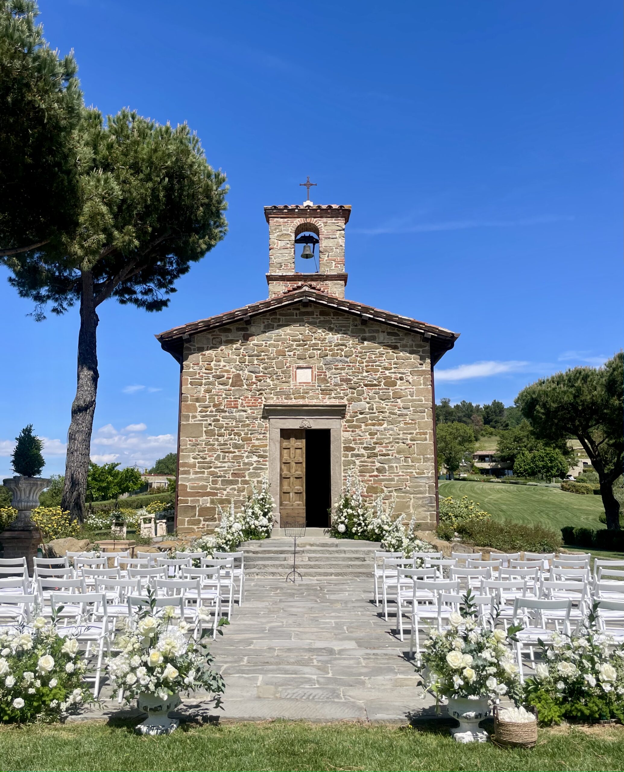If you choose a historic villa, it probably already has important decorative details, so better to opt for minimal and elegant arrangements. If, on the other hand, you choose a garden or a terrace, flowers and structures can be the protagonists without weighing it down.